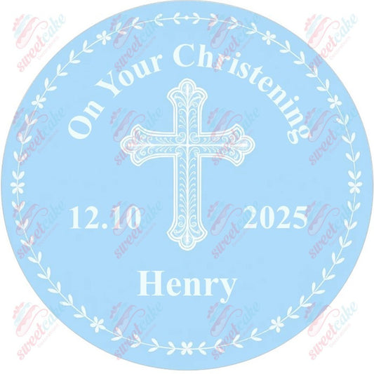 Personalised Christening or Baptism Cake Topper – Blue Floral & Gold Cross – Wafer Card or Icing Sheet