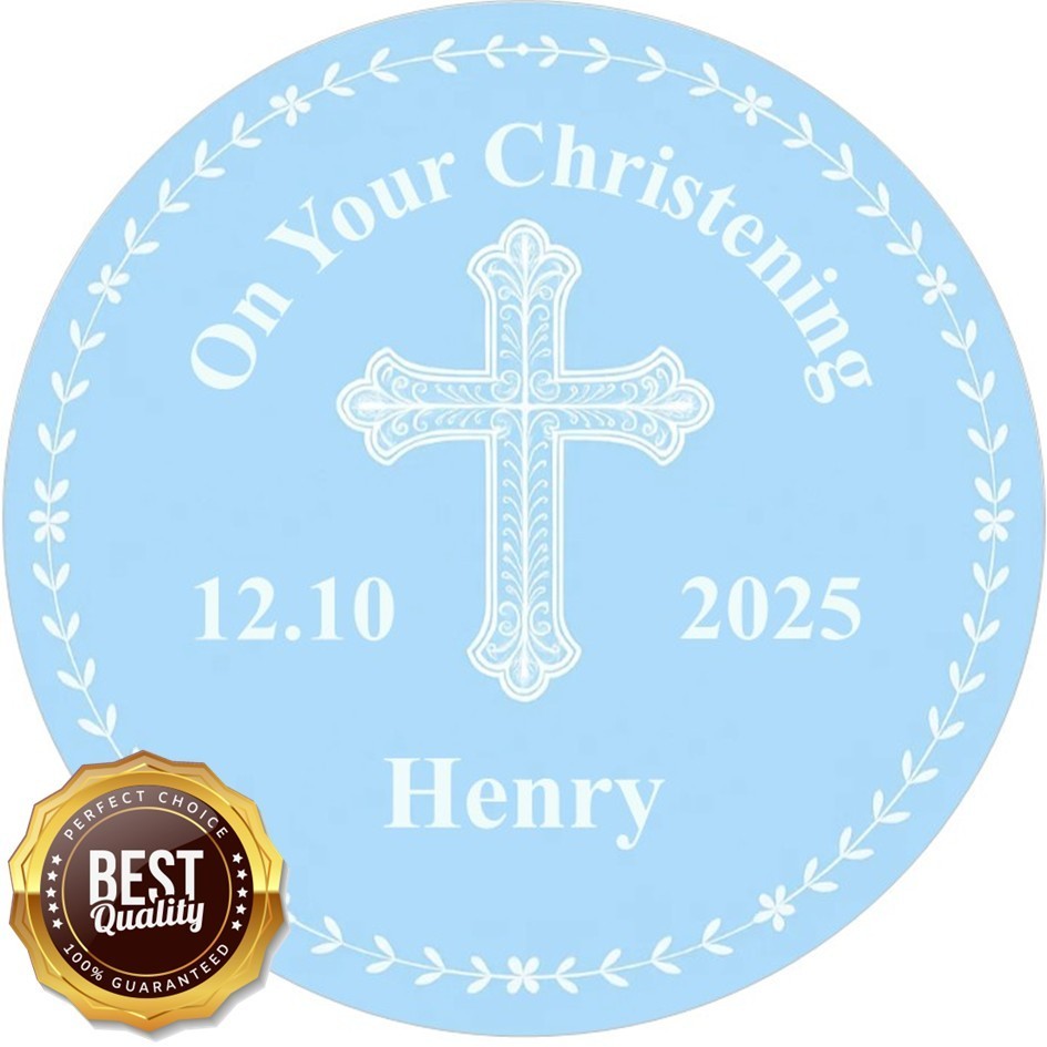 Make your child’s christening or baptism truly memorable with this elegant baby-blue edible cake topper, featuring a delicate white cross and laurel wreath. Personalised with your child’s name and event date, it’s the perfect finishing touch for a special day.